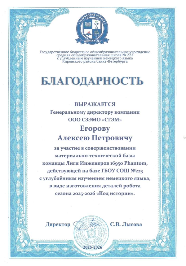 Команда по робототехнике «Phantom» из Государственного бюджетного общеобразовательного учреждения средней общеобразовательной школы №223 обратилась за помощью к предприятию «СЗЭМО «СТЭМ» в подготовке к международному чемпионату «Открытый Чемпионат по Робототехнике «Лига Инженеров».